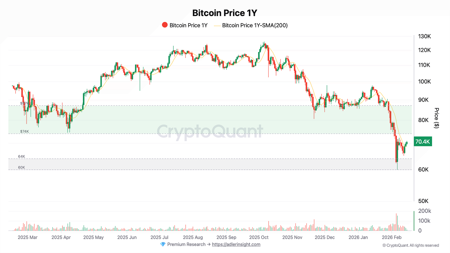 Since mid-week, Bitcoin has been attempting to recover, primarily driven by the derivatives market. A local long impulse appeared toward the end of the week: Open Interest increased by +1.24% in a single day, and the Funding Rate turned positive. At the same time, the week as a whole played out in deleveraging mode - total Open Interest declined approximately 2.5%, so the current move looks more like a short-covering and risk re-entry phase than sustainable accumulation of new longs.