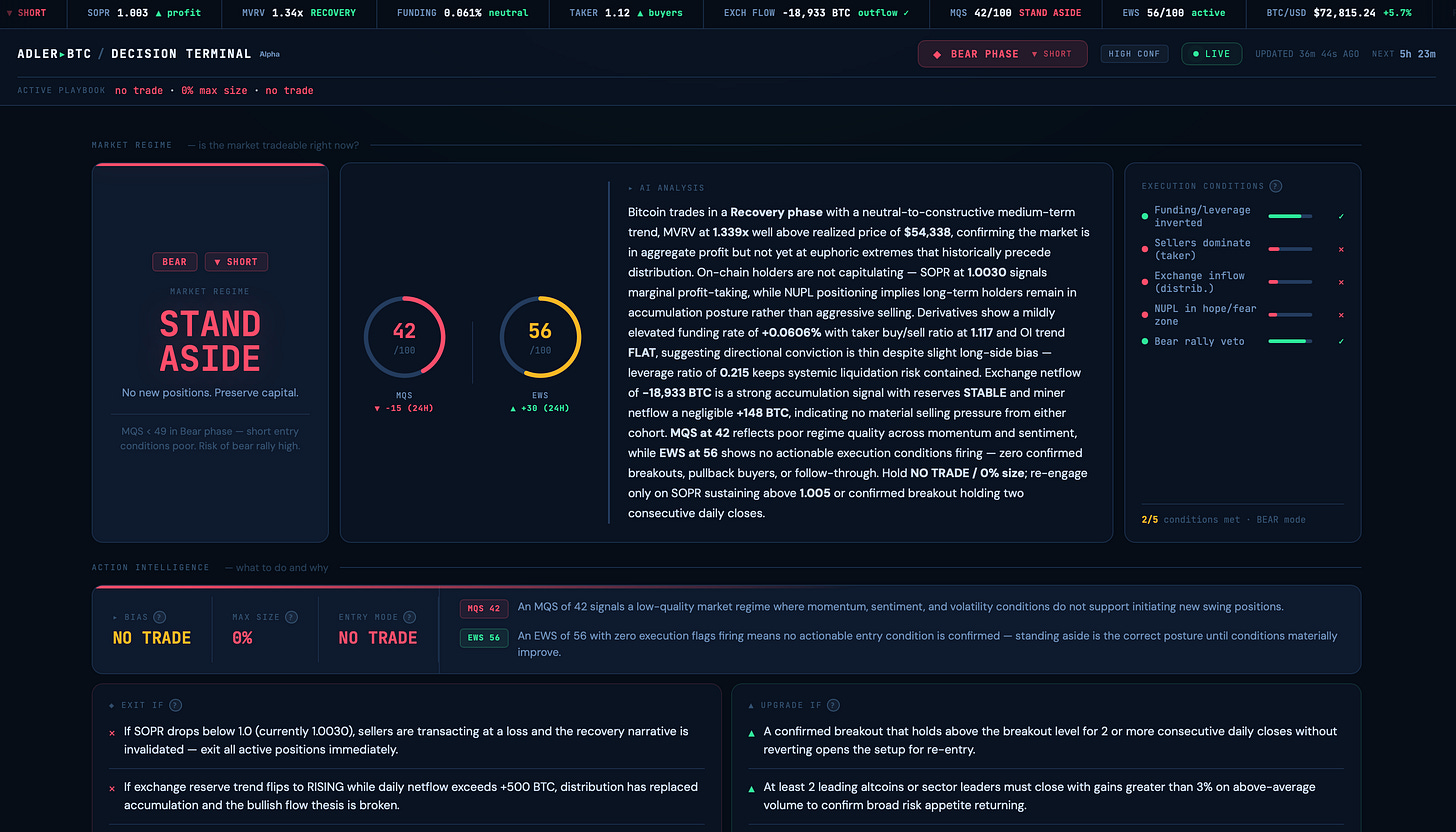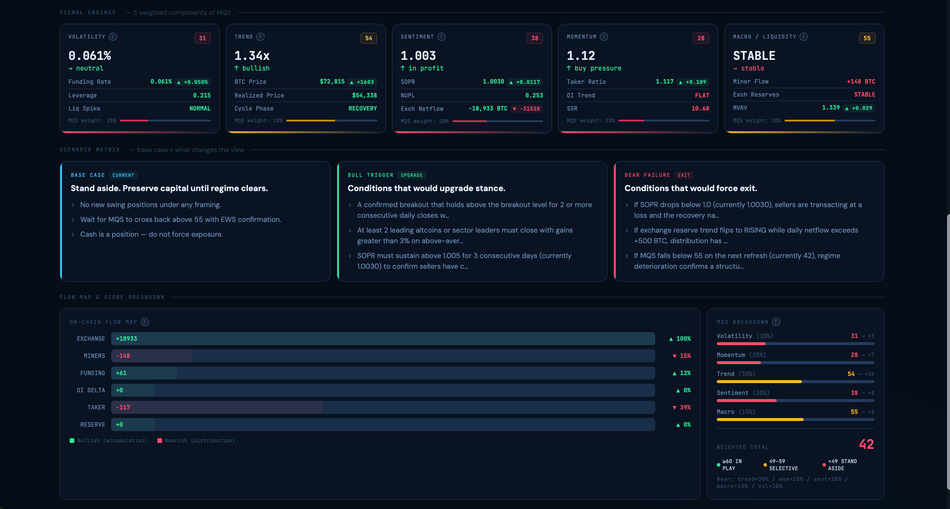 The terminal combines more than ten key Bitcoin on-chain and derivatives metrics - currently 14 signals - into a single composite indicator that shows how suitable the market is for a trade right now. Instead of the usual set of scattered charts and manual monitoring of dozens of indicators, we get a ready-made market interpretation: Market Quality Score (MQS), Execution Window Score (EWS), cycle phase according to Weekly Engine, market direction, and the final verdict - YES / CAUTION / NO - with a clear explanation in plain language.