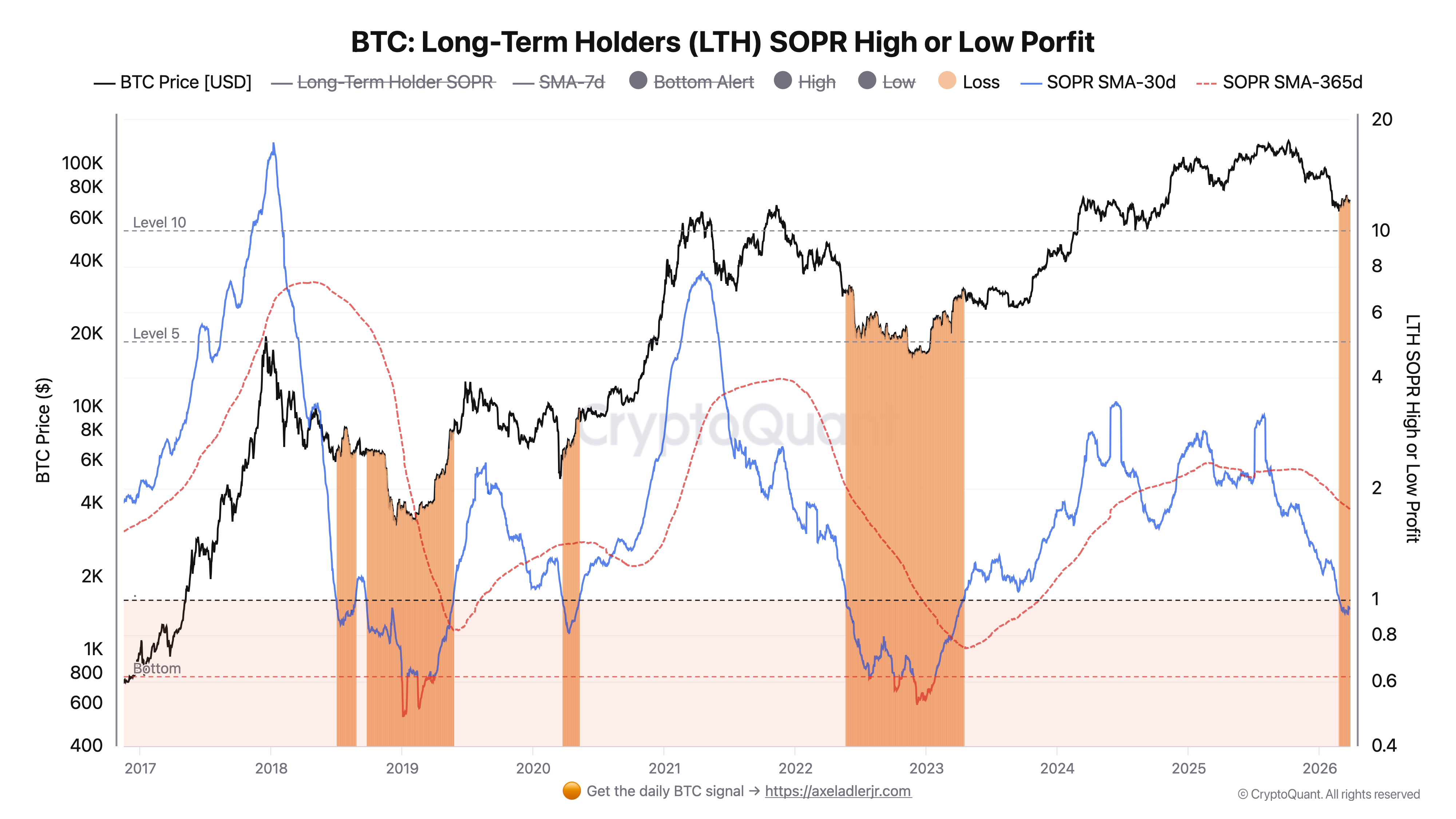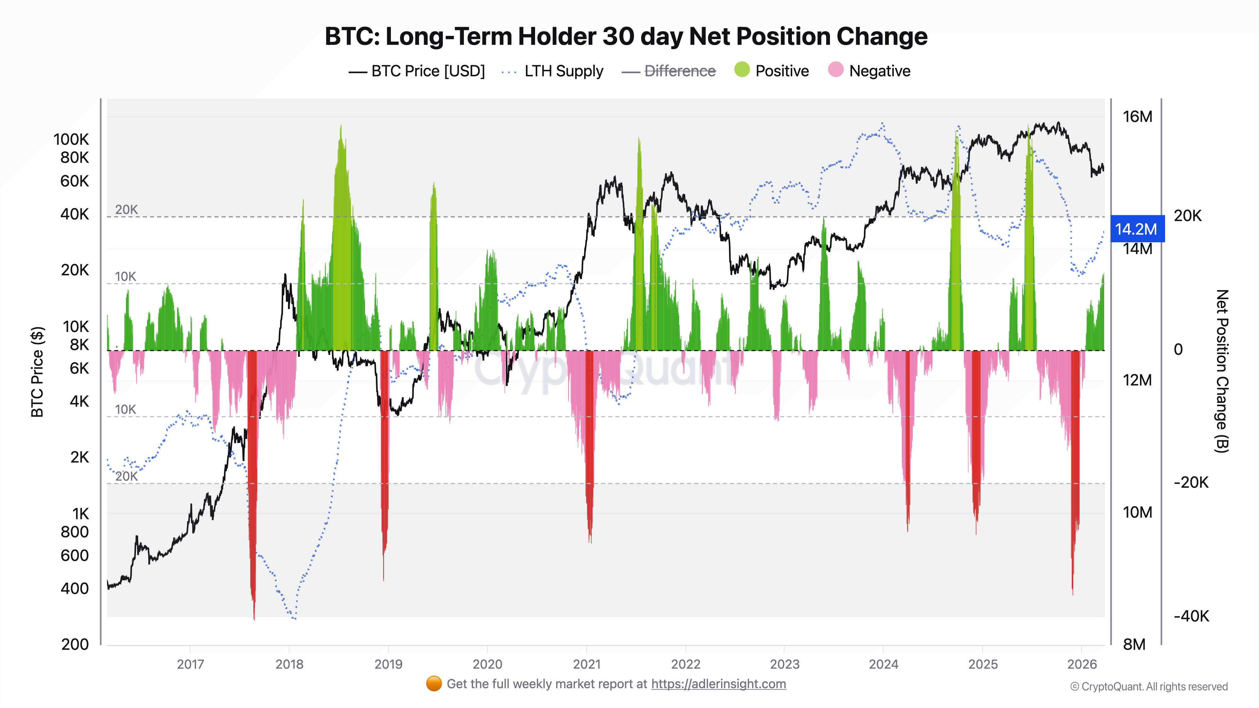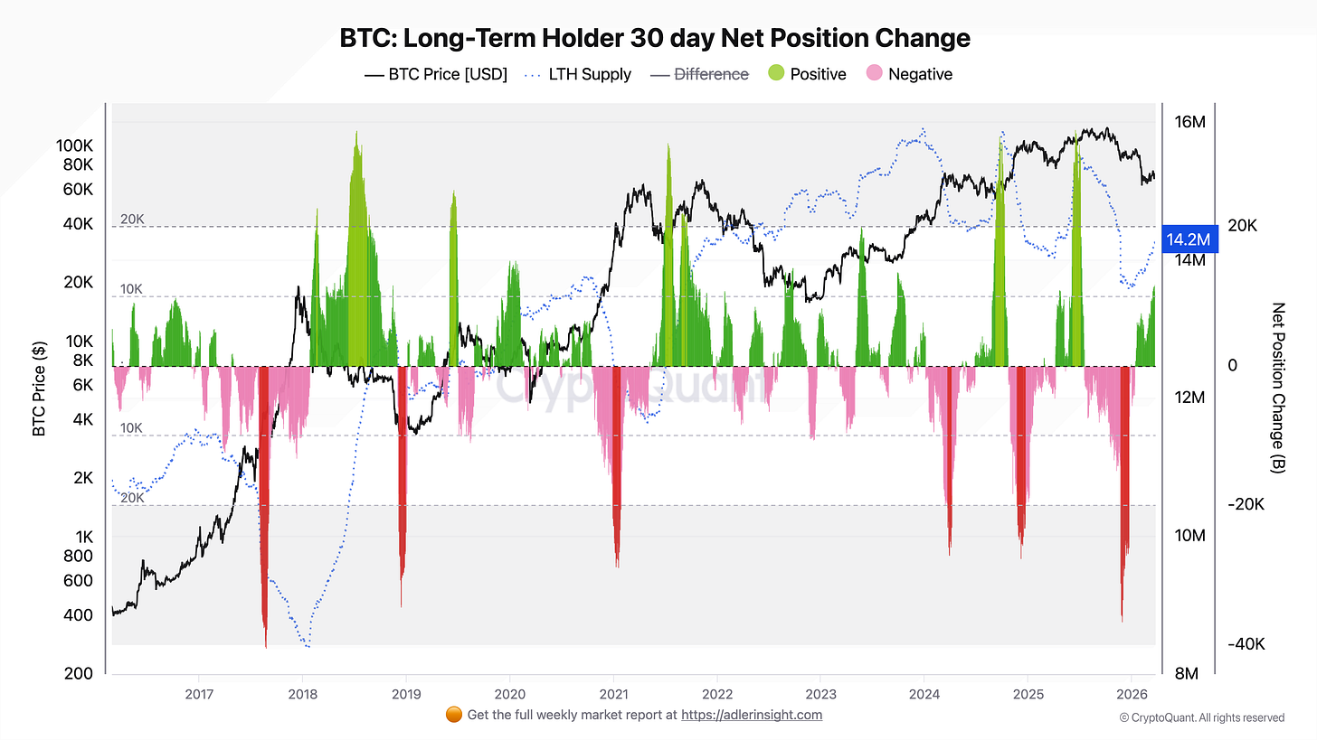 An important detail here is that LTH Net Position Change remains positive. That is, the cohort continues to accumulate, but internal tension has already emerged within it: some coins are being sold at a loss. It is precisely this combination that makes the current structure particularly fragile - this is not yet a full capitulation, but already an obvious signal that the resilience of accumulation is beginning to weaken.