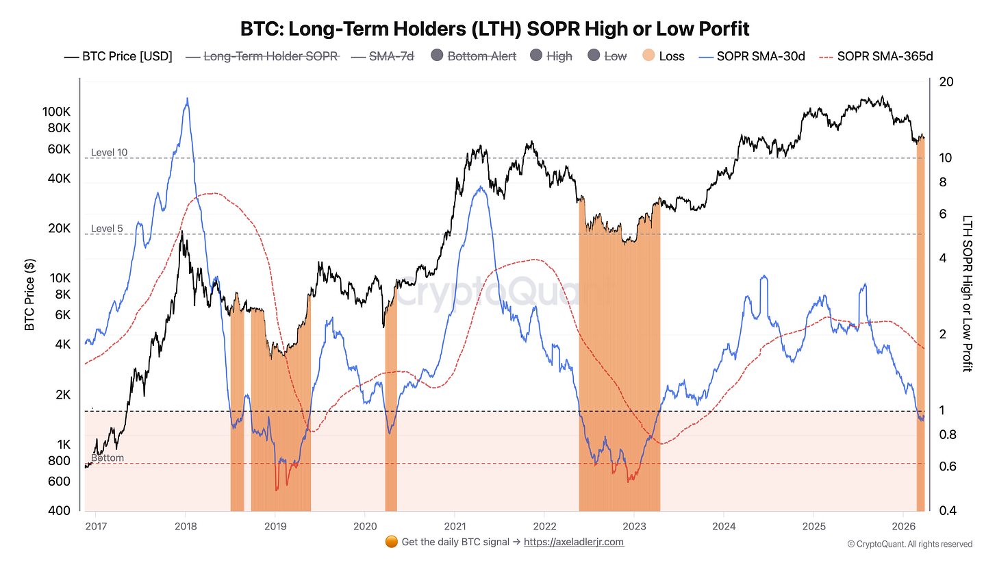 The main event of this week - the slow LTH SOPR (SMA-30d) dropped below 1.0 and is holding in the loss zone. This is one of the key signals of the current phase: long-term holders are on average already realizing sales below their cost basis, and such regimes appeared during deeper and more prolonged bearish market segments, which is very clearly visible on the chart below.