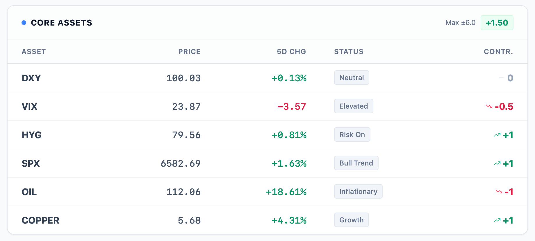 Here is why. Total Raw Score +2.10 within a range of -9 / +9 - this is a small positive, not a powerful impulse. This level does not speak to broad-based risk appetite, but rather that some risk assets have already begun to recover while defensive and inflationary headwinds have not disappeared.