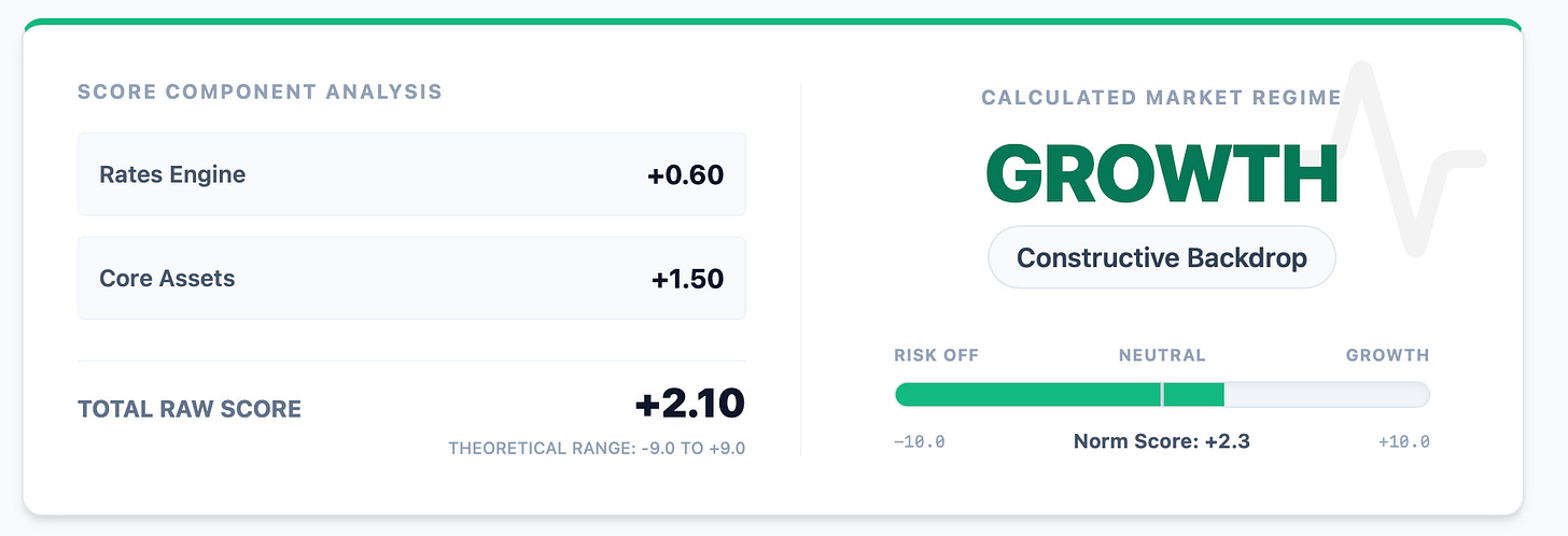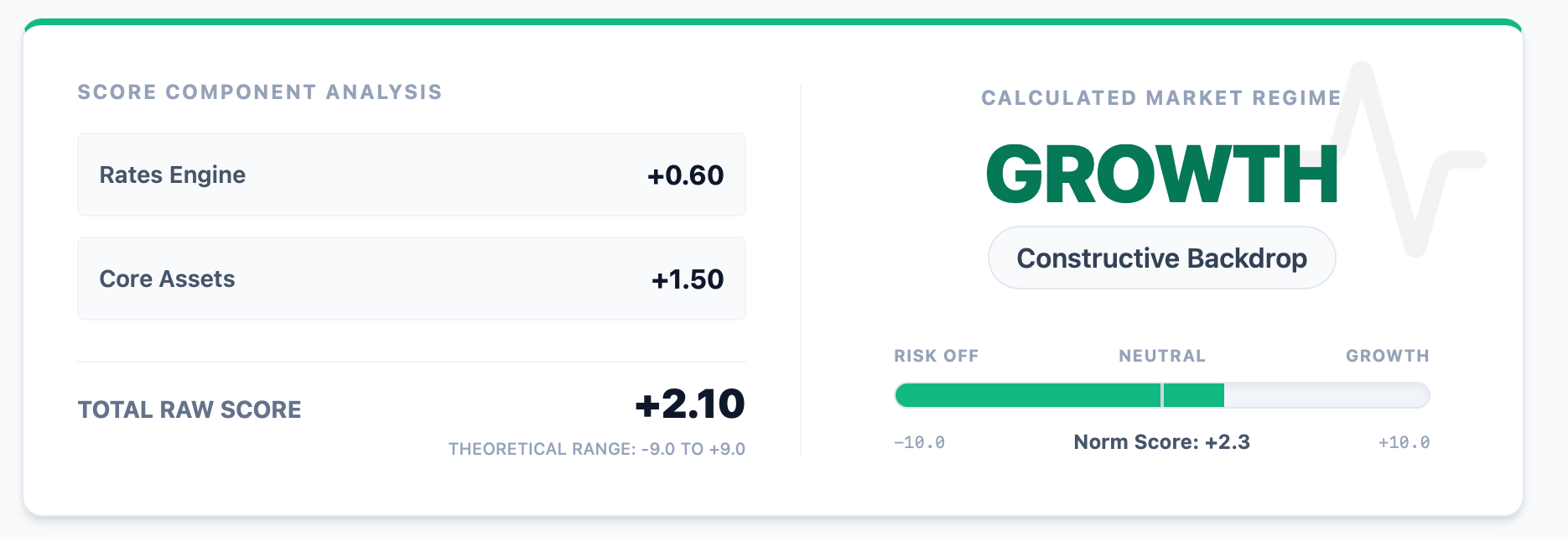 The most accurate summary for this block: fragile Risk On / constructive growth - meaning the market is standing in a moderately positive regime, but that regime is held on a thin base and can easily revert back to neutral.