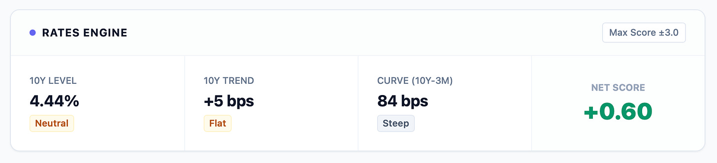 Rates Engine +0.60 - this is more “rates are not in the way” than “rates are helping”. 10Y at 4.44% is marked as neutral, yield growth of just +5 bps - flat, curve +84 bps steep. So the rate backdrop does not look like a hard risk-off trigger. It removes pressure but does not create a strong bullish thrust.